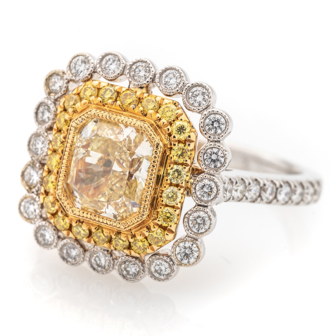 Custom made double halo ring with natural, fancy yellow and white diamond halos, with GIA certified yellow RAD center stone.