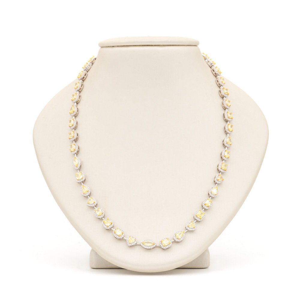 Prong set, mixed fancy shaped diamond necklace (CU+HS+MQ+PS+OV) with spacing bars in between links, and microprong halos around all FY center diamonds.