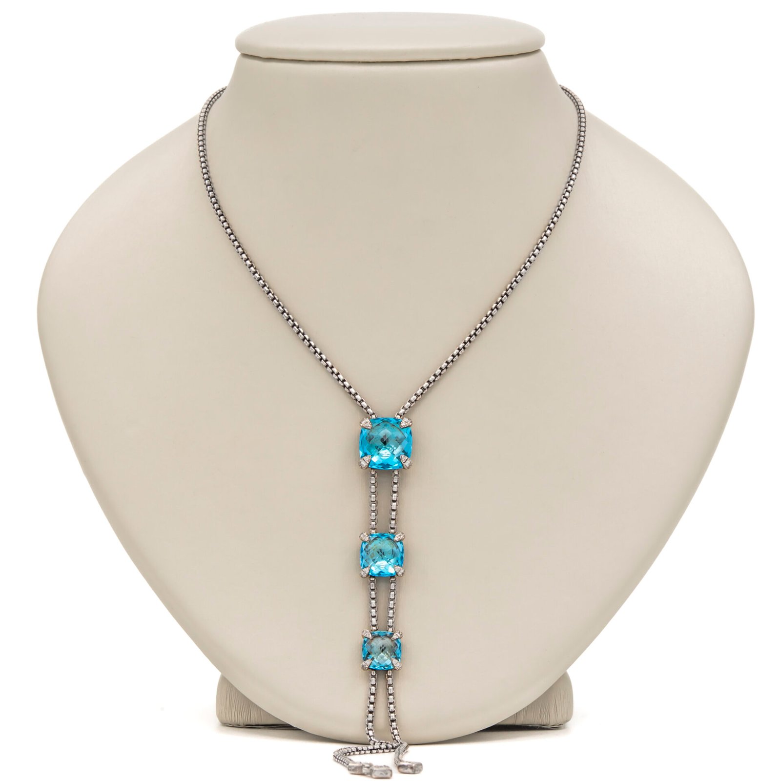 David Yurman 3 Stone Blue Topaz Fashion Necklace 25in Adjustable with 5in Dangle