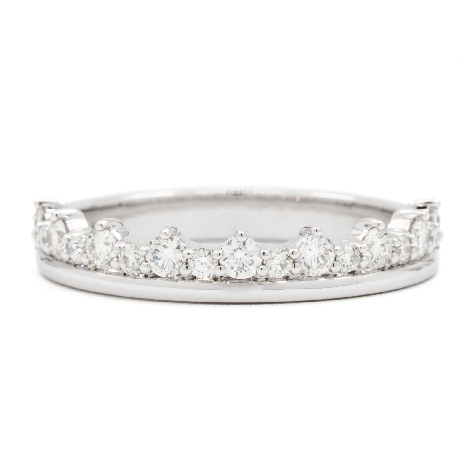 Stackable band with one polished edge and one alternating sized diamond edge.