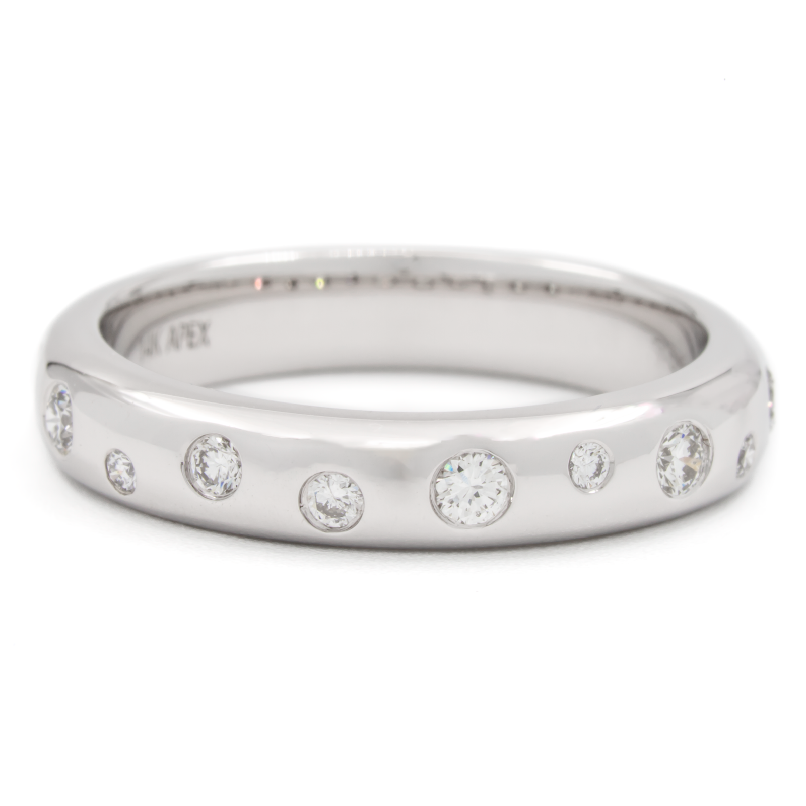 Fashion “sprinkle” band with mixed size round diamonds flush set on top surface of band.