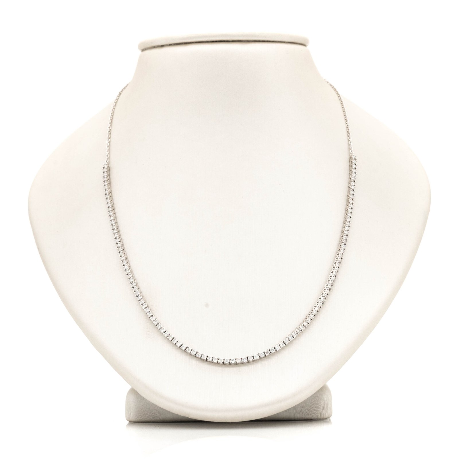 A 14K WG, fashion necklace with 8.5″ diamonds in front, adjustable diamond cut cable chain in back.