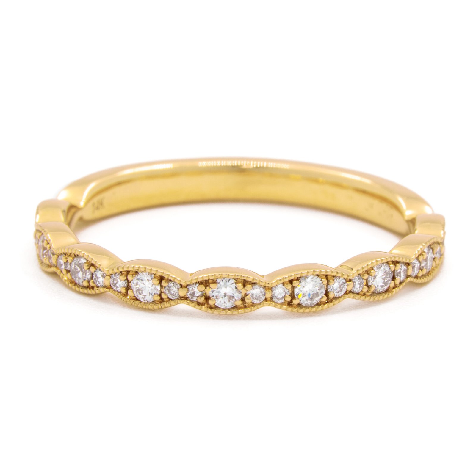 Band with bead set diamonds in scalloped shapes with millgrain edges, almost 3/4 way around shank.