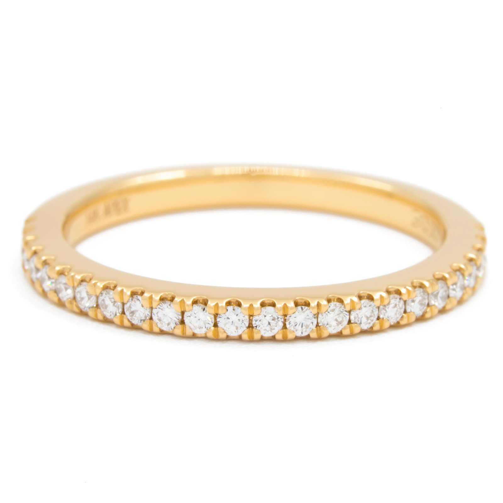 Straight, microprong set diamond wedding band with 1.3mm diamonds halfway around shank.