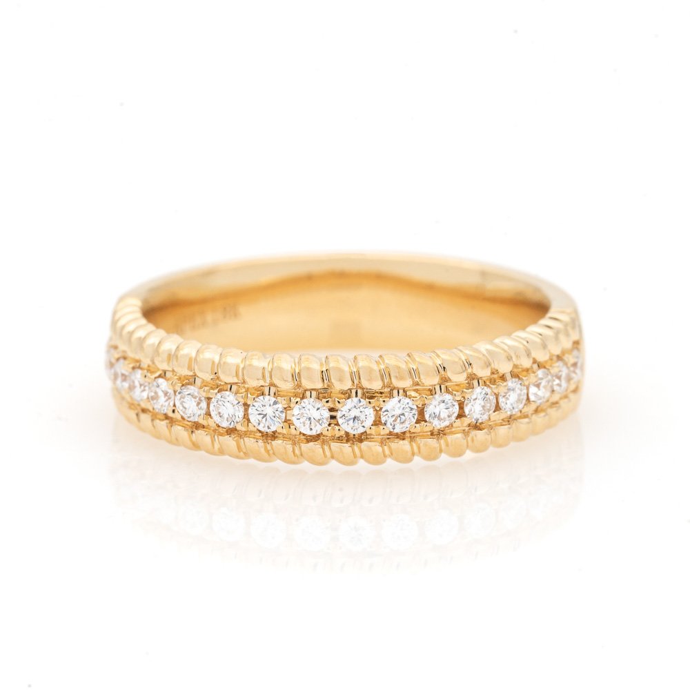 Bead set round diamond band with roped edges and 1.6mm diamonds only halfway around shank.