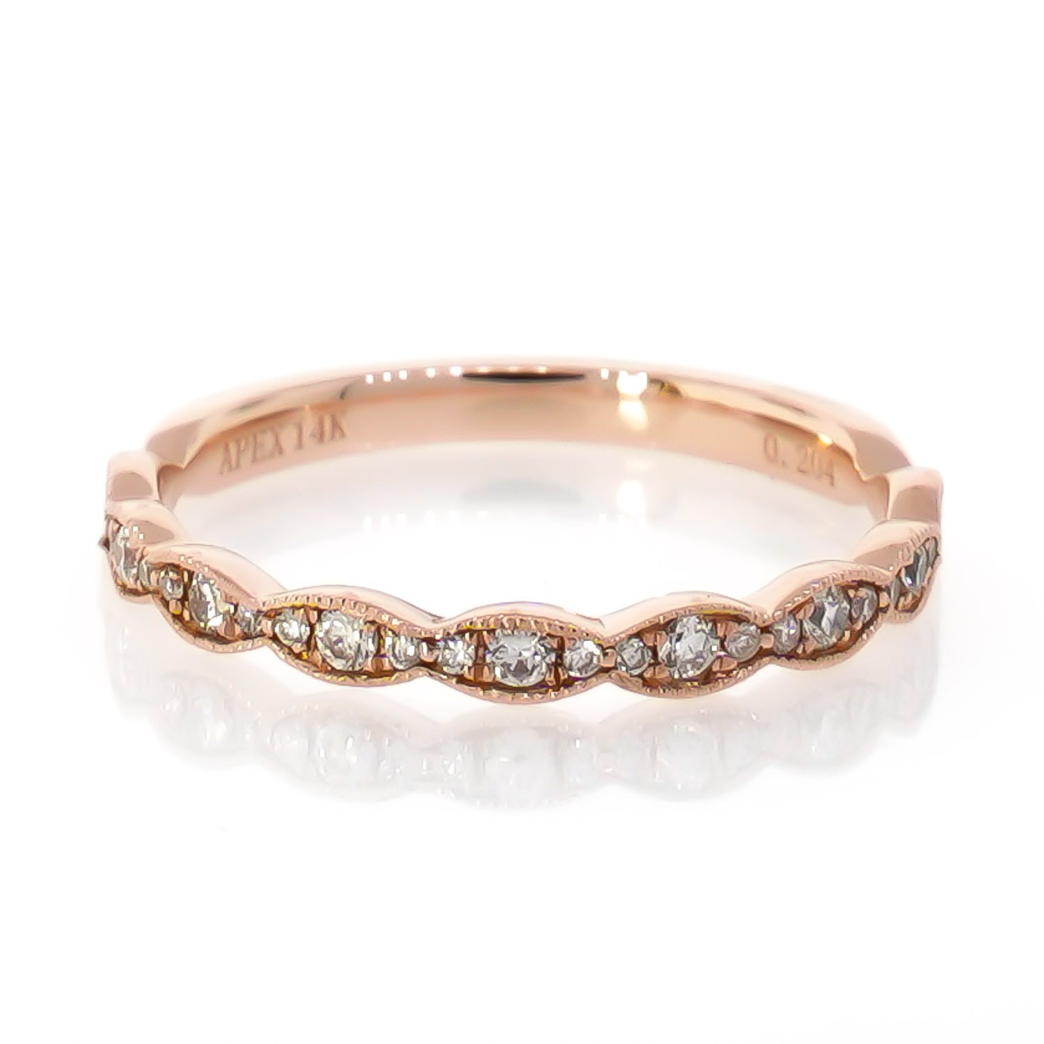 Band with bead set diamonds in scalloped shapes with millgrain edges, almost 3/4 way around shank.