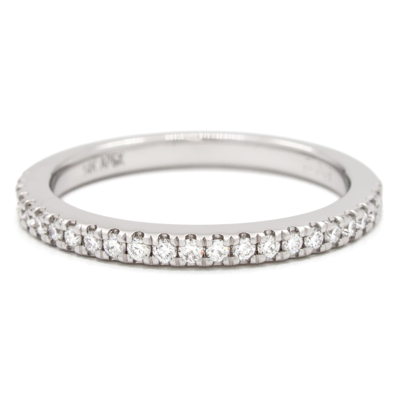 Straight, microprong set diamond wedding band with 1.3mm diamonds halfway around shank.