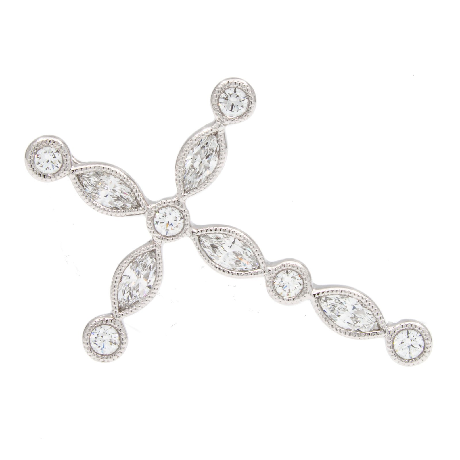 Cross pendant with alternating bezel set BR and MQ diamonds with hidden bail and millgrain edges.