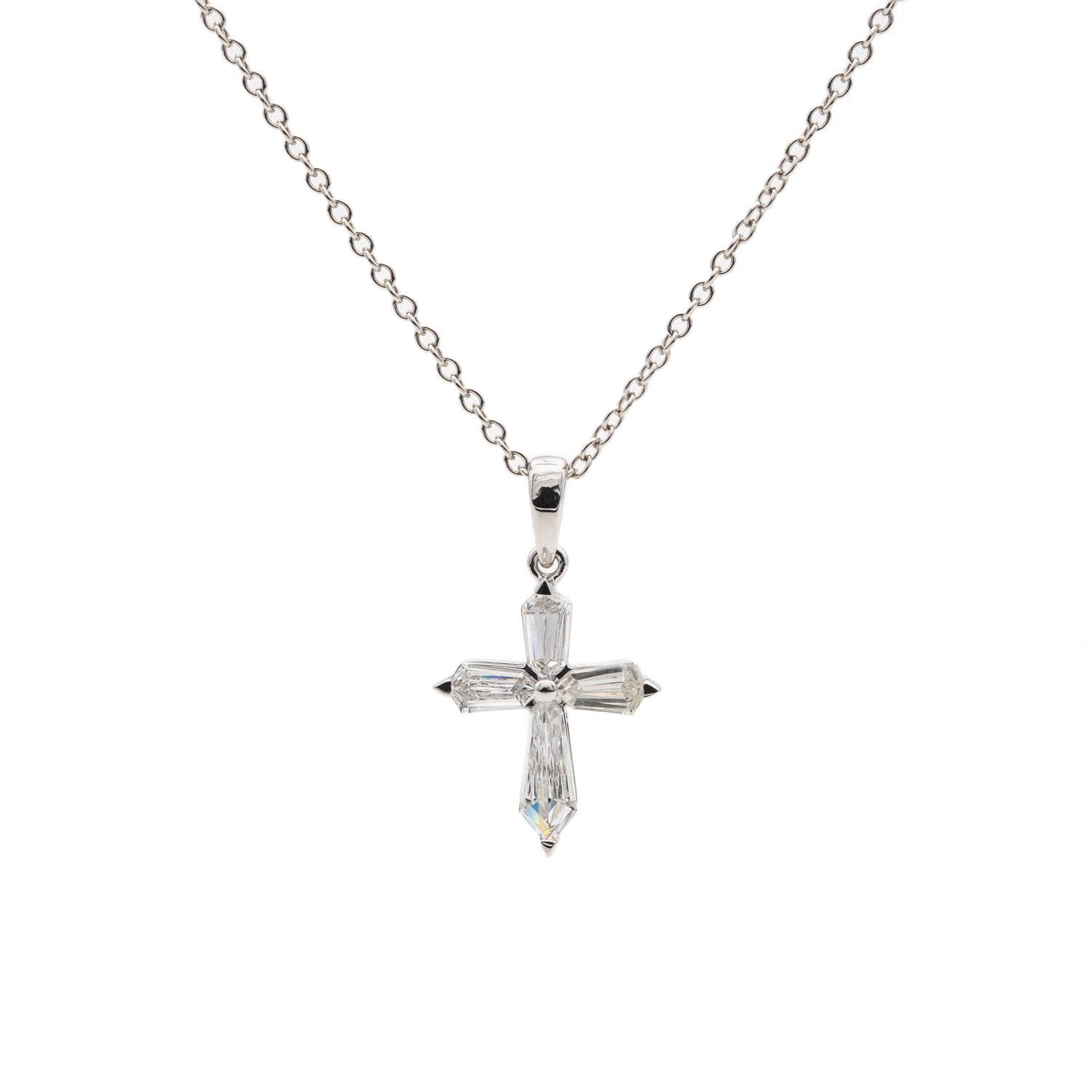 Custom cross pendant made with kite shaped diamonds in basket mounting with polished bail.