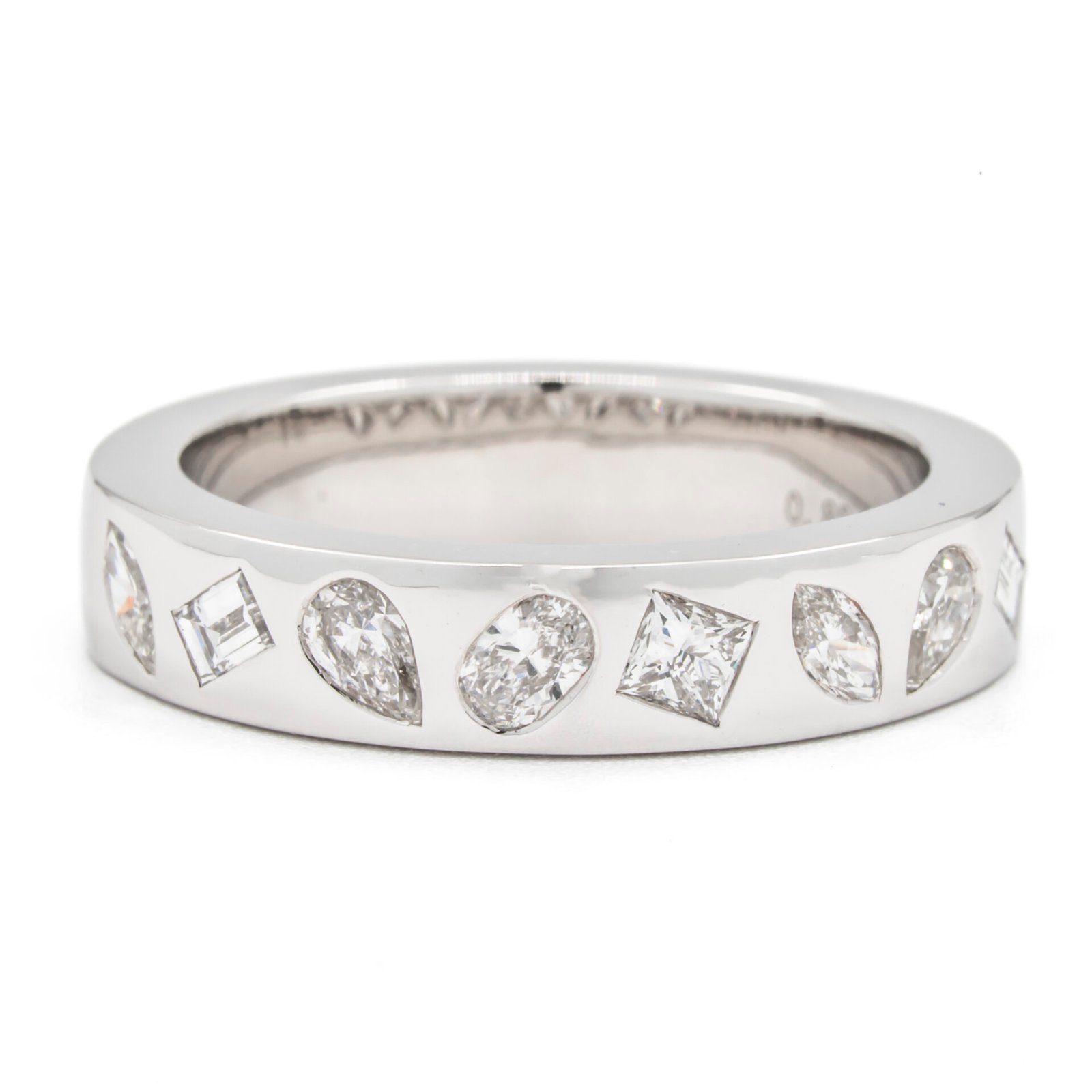 Straight, stackable fashion band with mixed fancy shape diamonds, flush set halfway around shank.