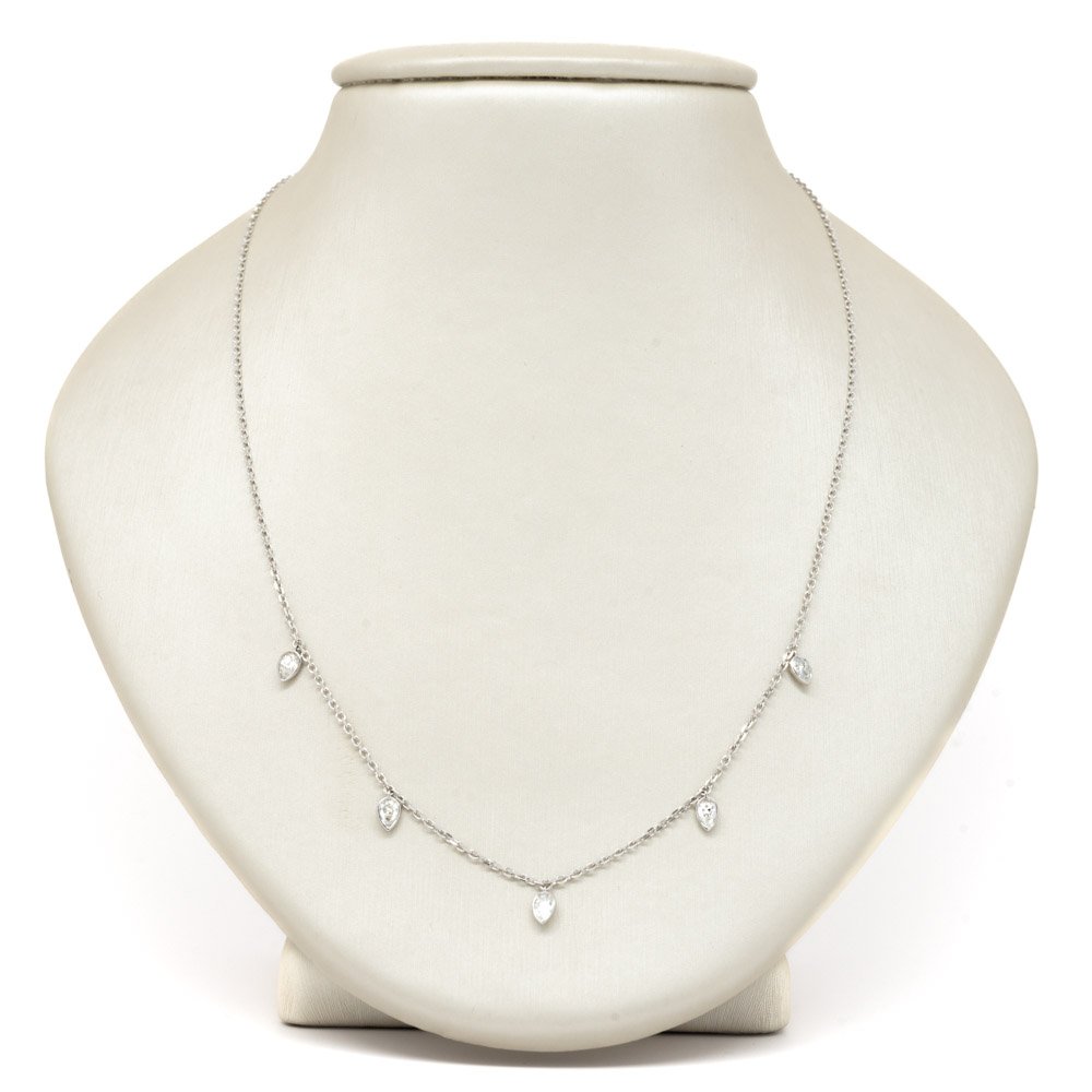 Dainty fashion necklace with 5 bezel set PS diamond dangles in front, on adjustable length diamond cut cable chain.