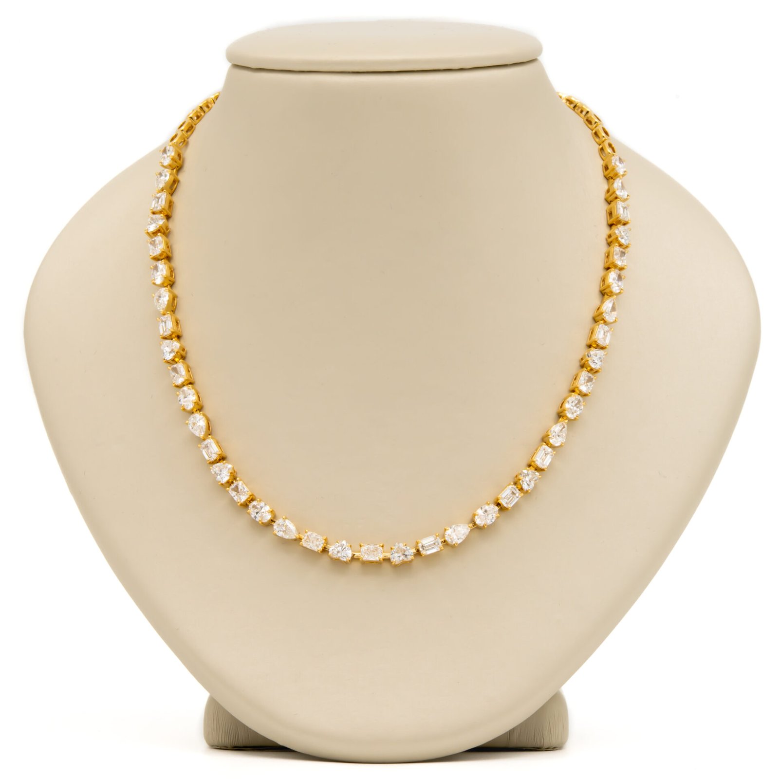 Mixed fancy shaped diamonds (Est 0.30ct Each) prong set in front half of necklace, with plain open metal links in back.