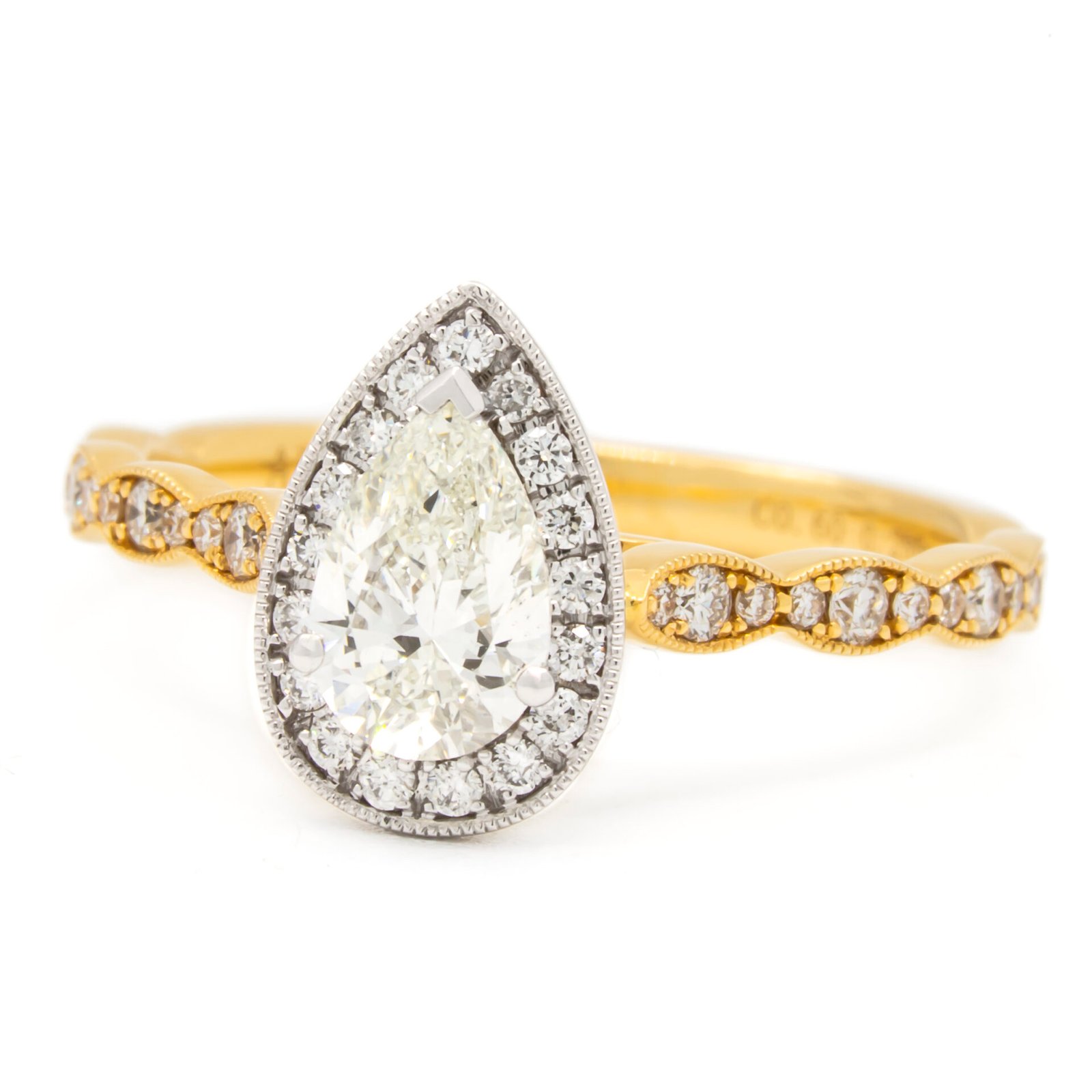 Cathedral shank PS halo ring with 3/4 way bead set diamonds in scalloped shapes with millgrain edges. YG shank, WG halo plate.