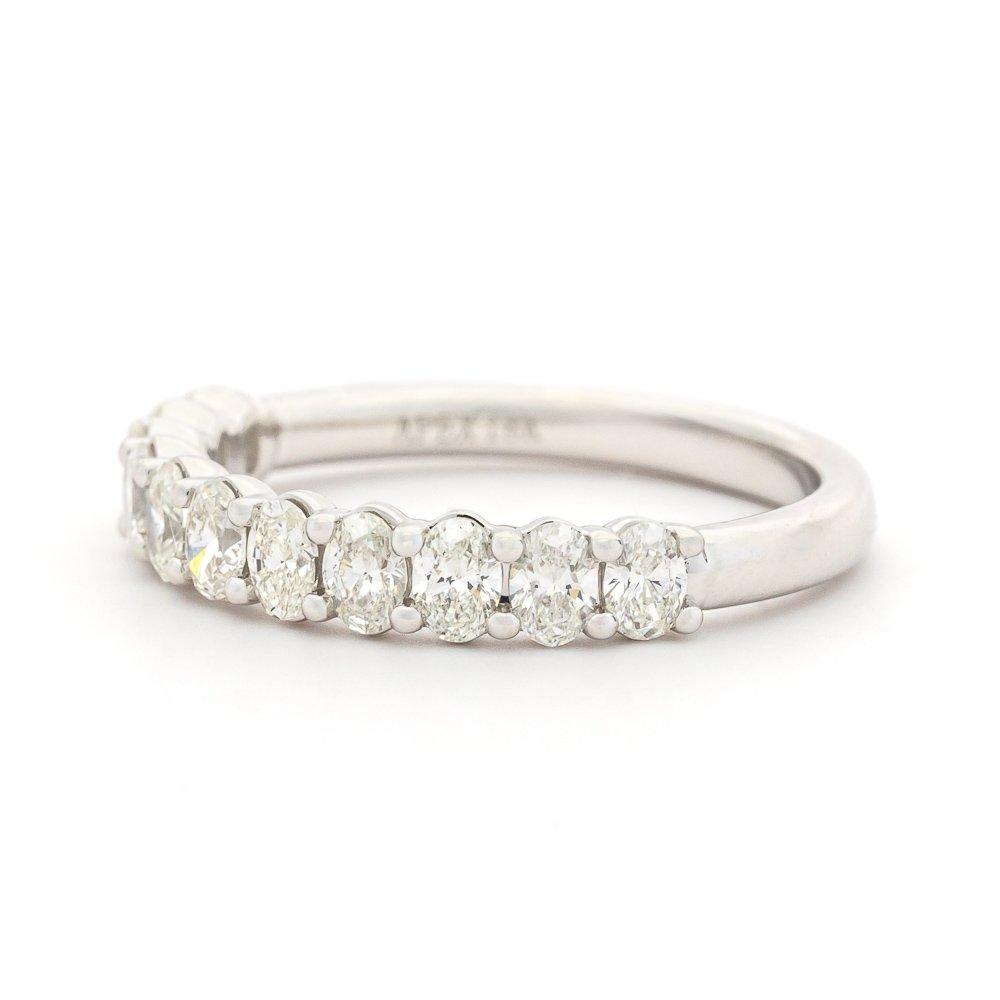 Low profile, buttercup style band mounting with shared prong set oval shaped diamonds 0.07ct each.