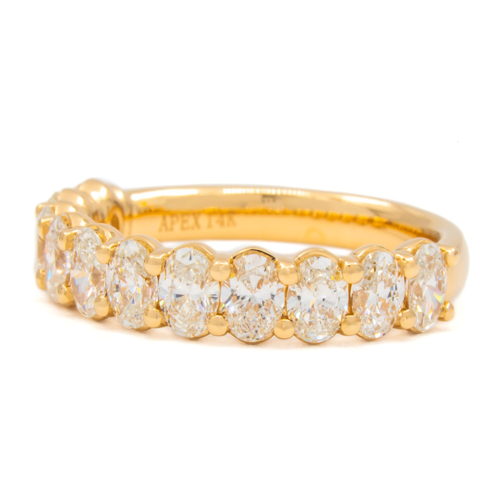 Low profile, buttercup style band mounting with shared prong set est. 0.15ct each oval shaped diamonds.