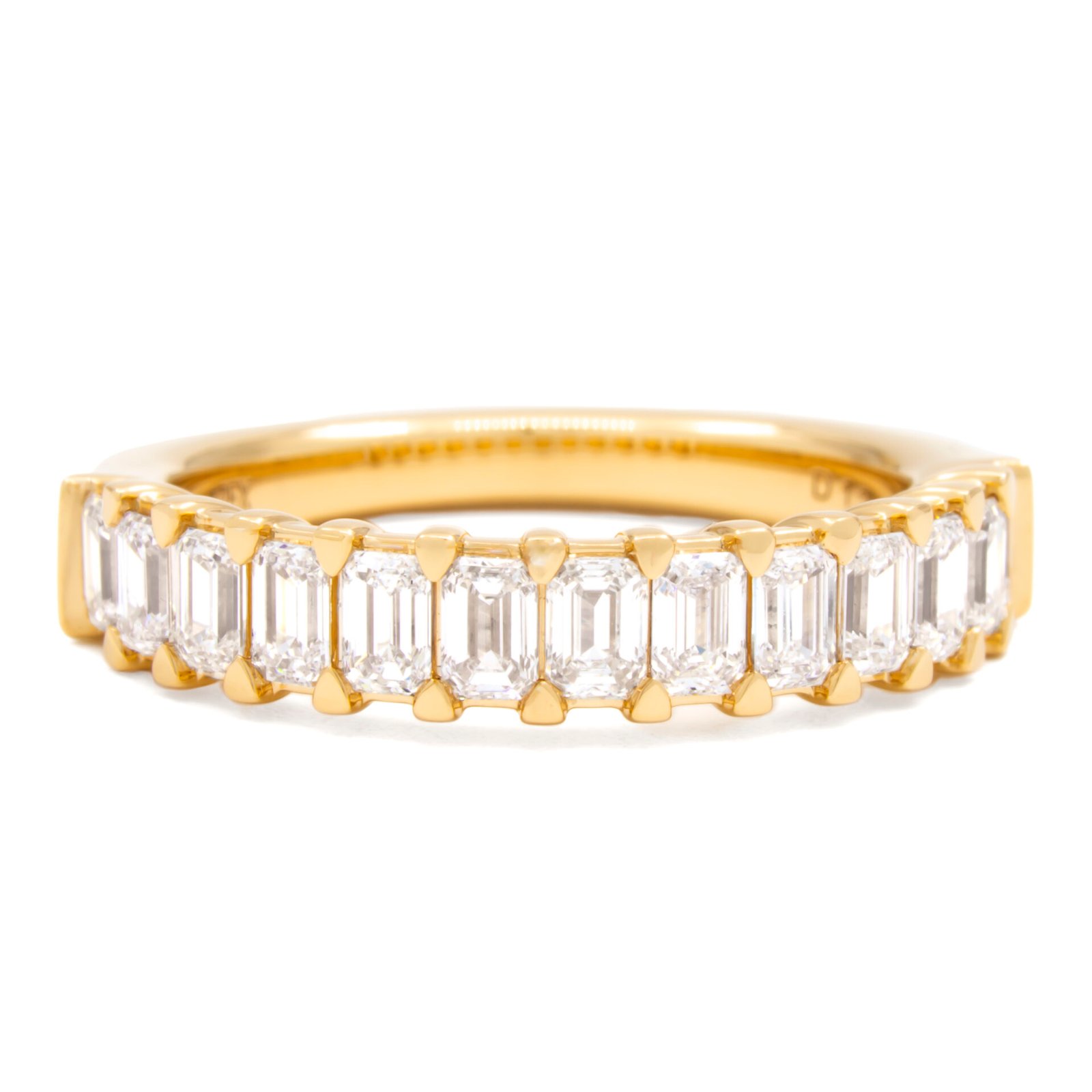 Low profile, buttercup style band mounting with shared prong set emerald cut diamonds est 0.10ct each or less.