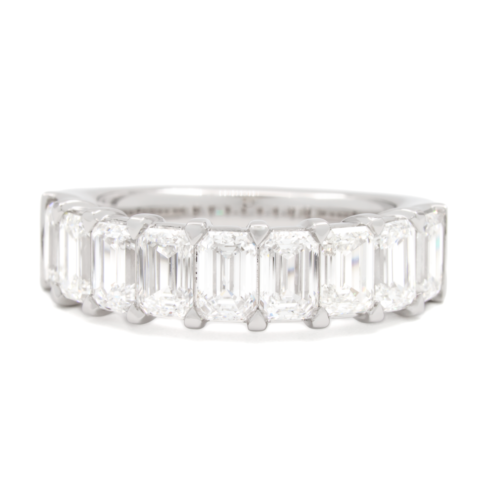 Low profile, buttercup style band mounting with shared prong set emerald cut diamonds est 0.31ct each.