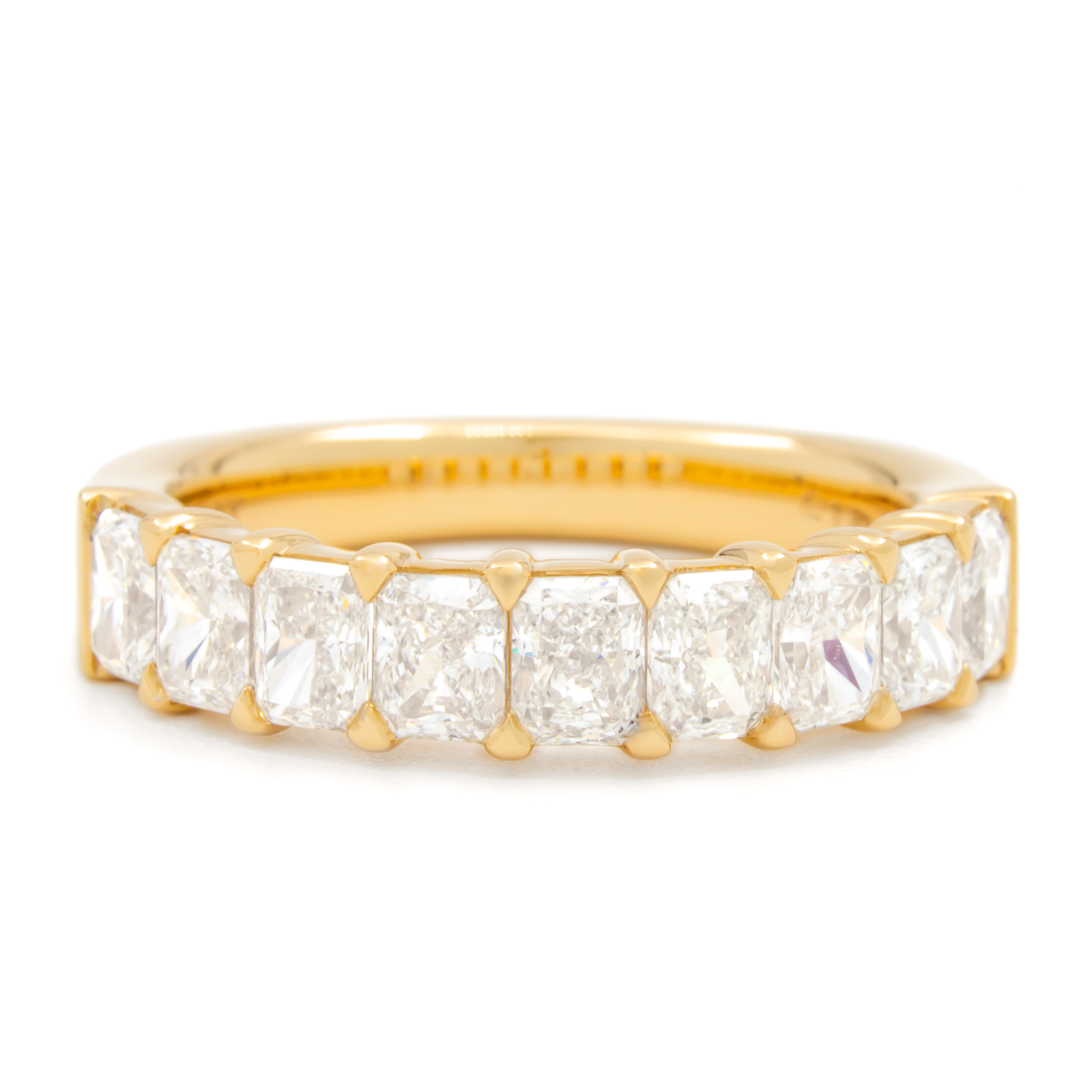 Low profile, buttercup style band mounting with shared prong set radiant cut diamonds est 0.20ct each.