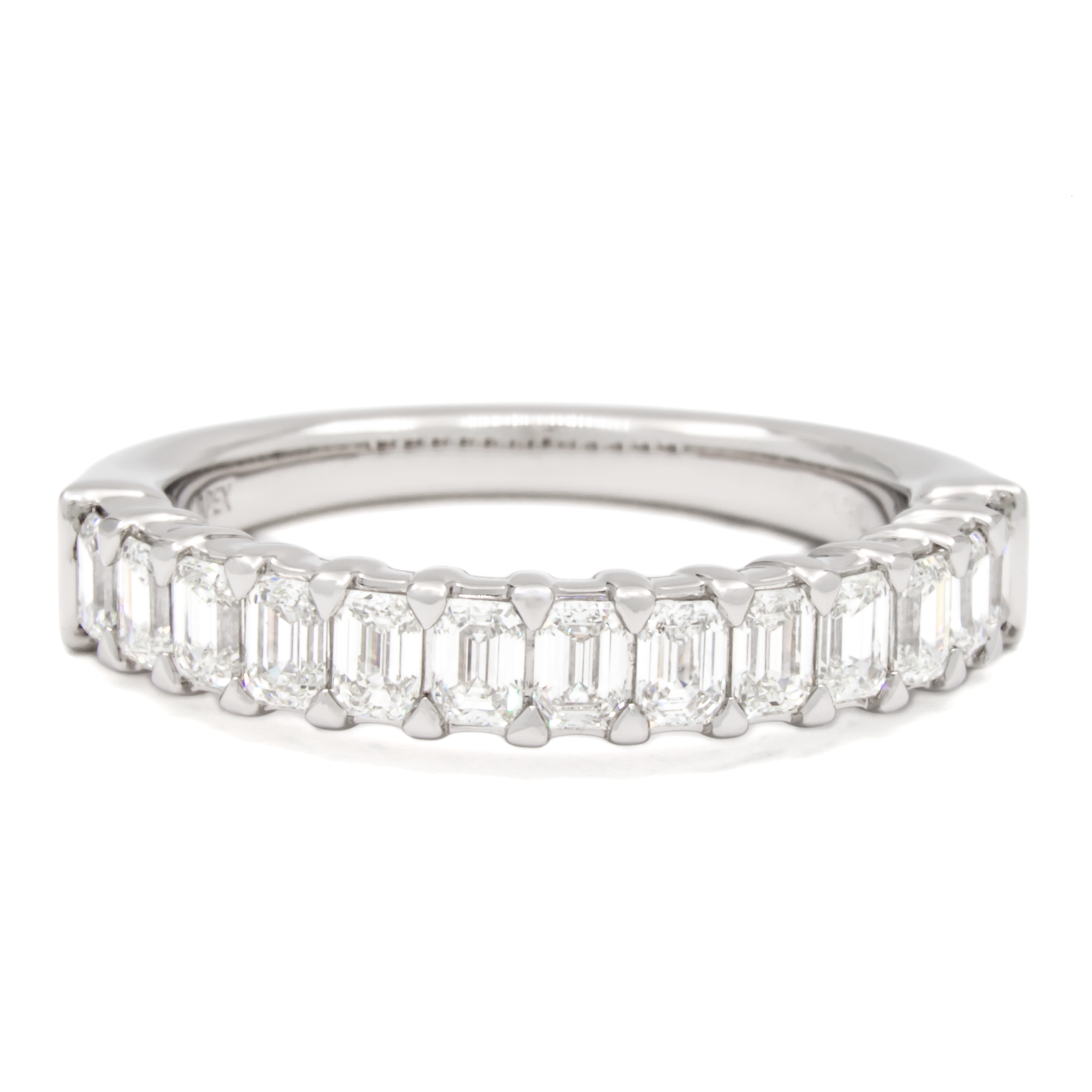 Low profile, buttercup style band mounting with shared prong set emerald cut diamonds est 0.08ct each.