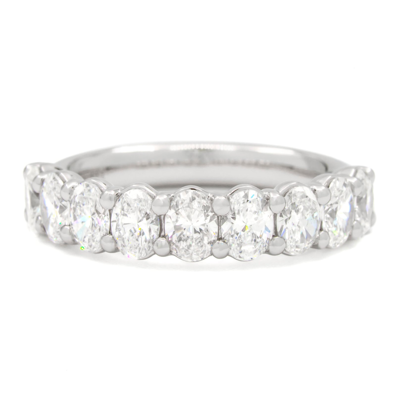 Low profile, buttercup style band mounting with shared prong set oval shaped diamonds, est 0.16ct each.