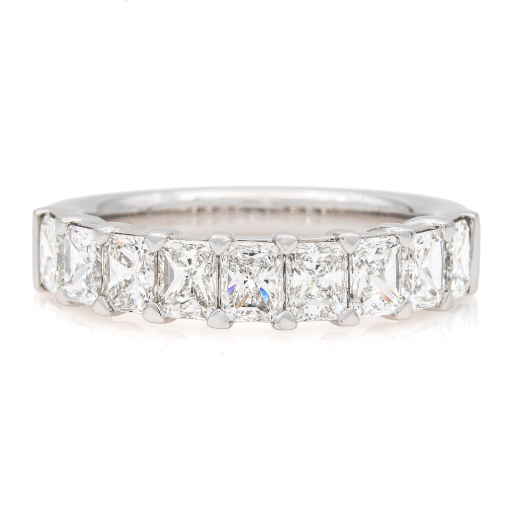 Low profile, buttercup style band mounting with shared prong set radiant cut diamonds 0.20ct each.