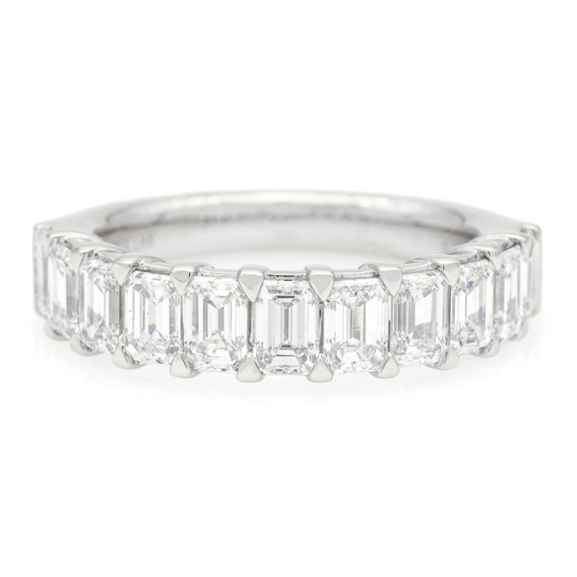 Low profile, buttercup style band mounting with shared prong set emerald cut diamonds 0.19ct each.