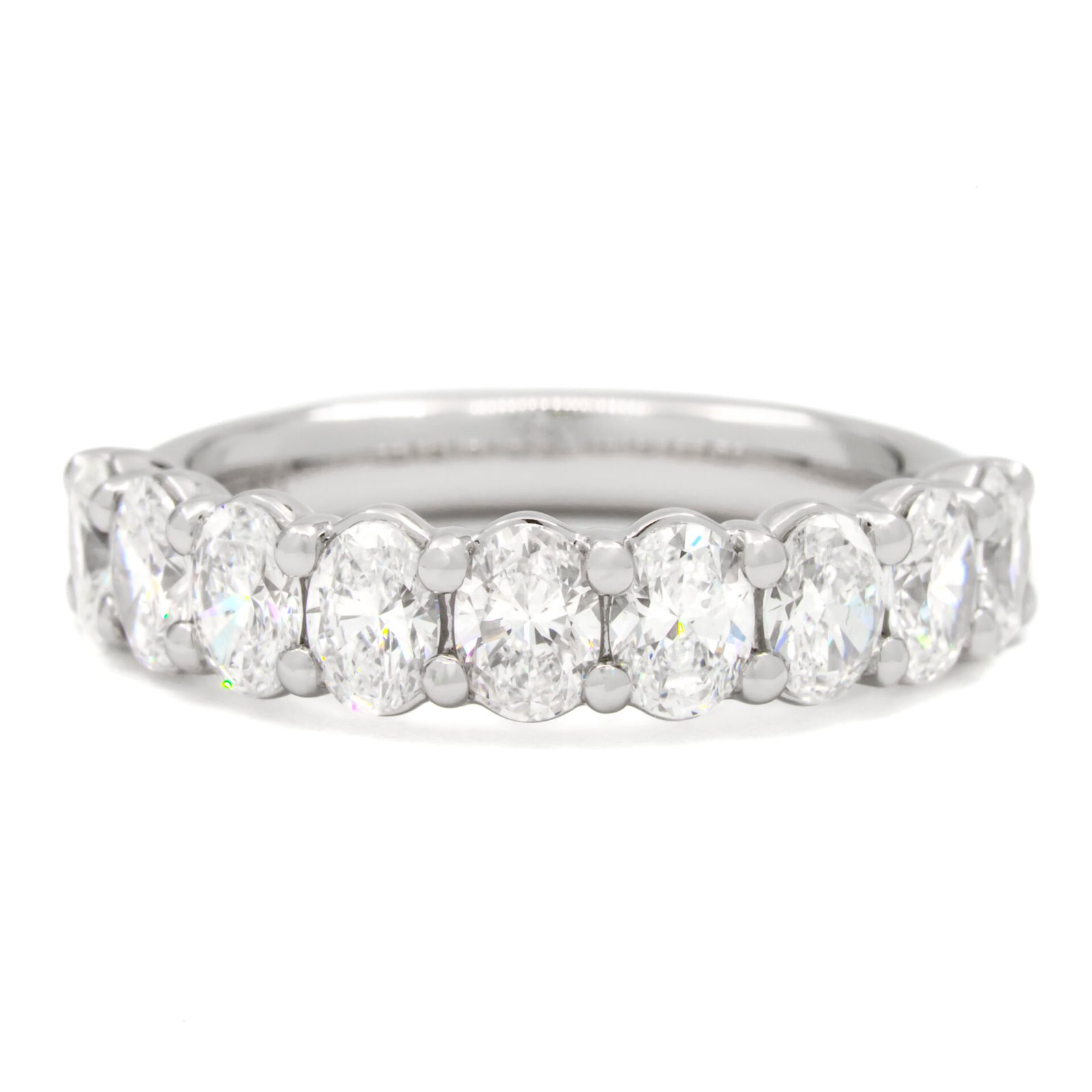 Low profile, buttercup style band mounting with shared prong set oval shaped diamonds est. 0.19ct each.