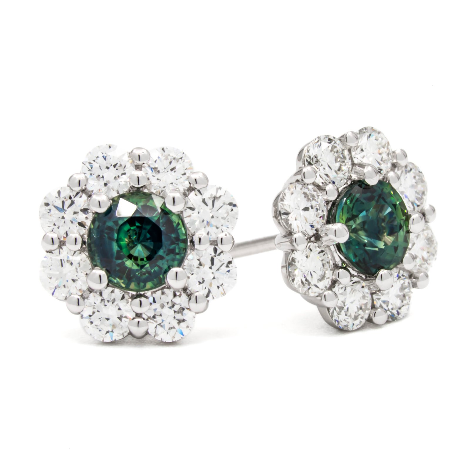 Custom made halo earrings with round teal sapphire center stones and 2.6-2.7mm round shaped diamond halos.