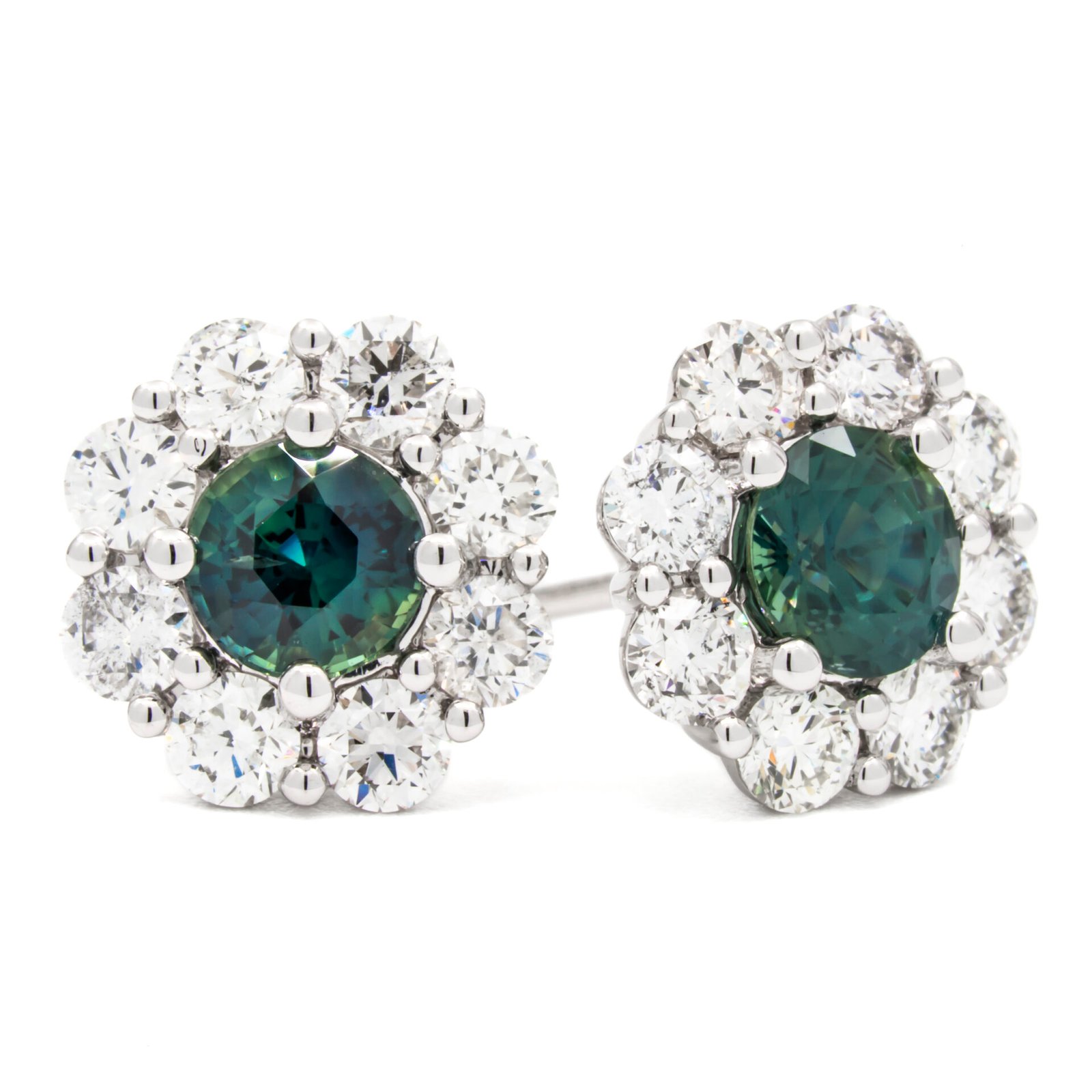Custom made halo earrings with round teal sapphire center stones and 2.6-2.7mm round shaped diamond halos.