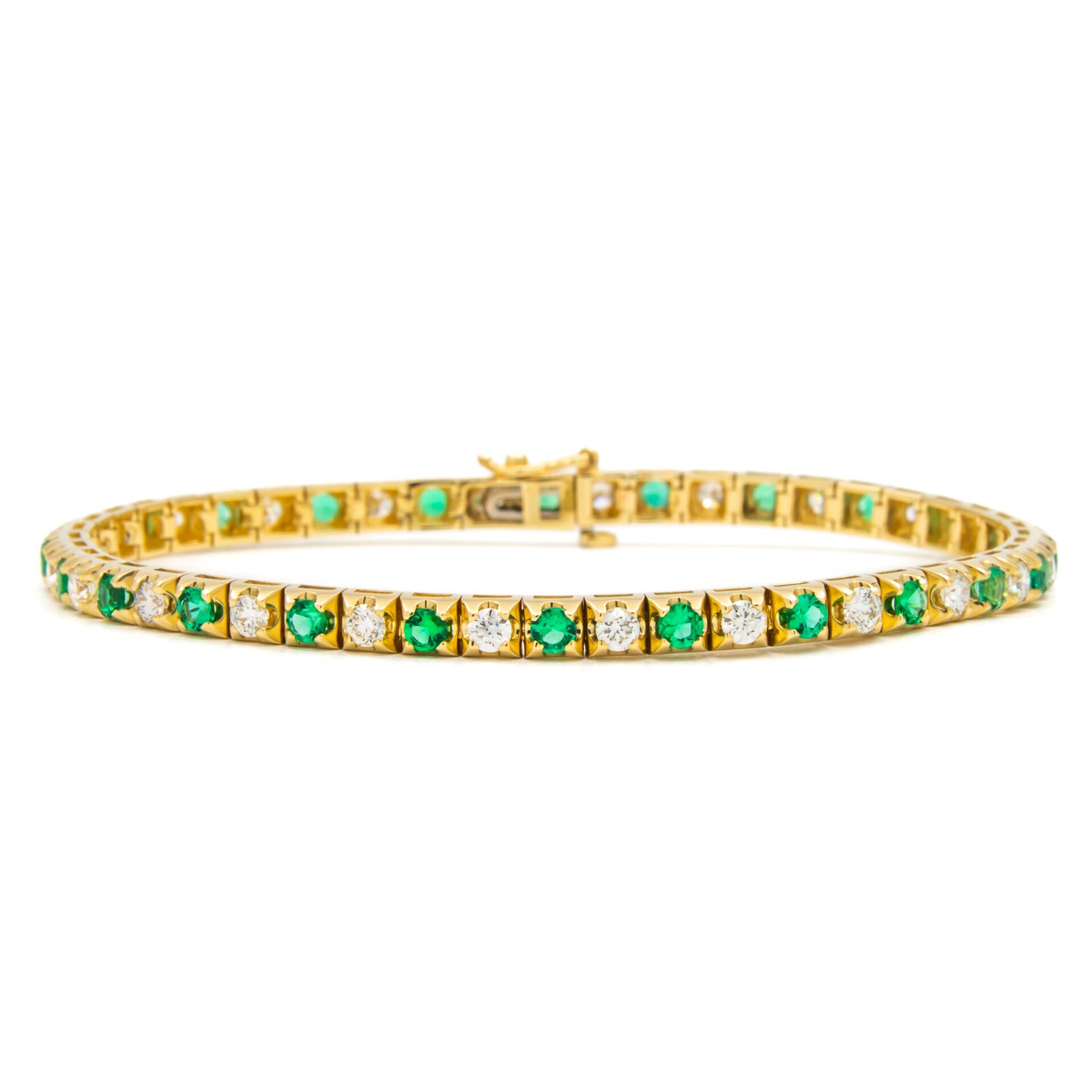 Tennis bracelet with basket links and microprong set 2.7-2.8mm alternating diamonds and green emeralds.