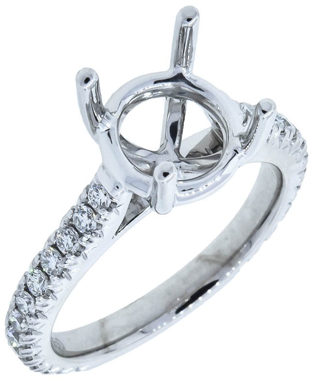 Cathedral ring mounting with 1.5mm diamonds set 3/4 way around shank in fishtail style prongs, with 4-prong basket head for 2ct BR center stone.