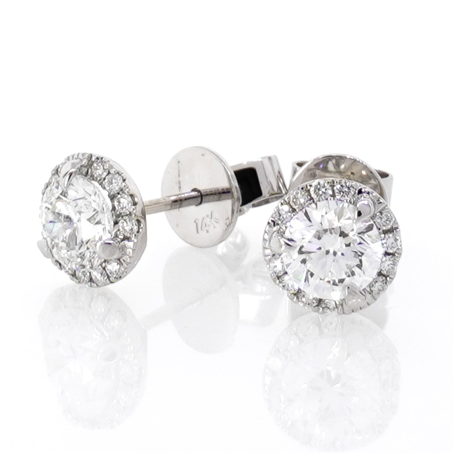 Round halo stud earrings with 1.0mm halo diamonds and 5.0mm round center stones.