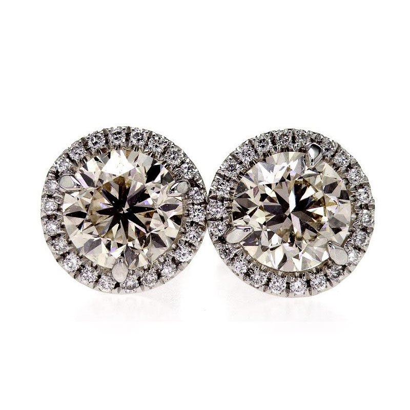 Round halo stud earrings with 1.0mm halo diamonds and 7.4mm round center stones.