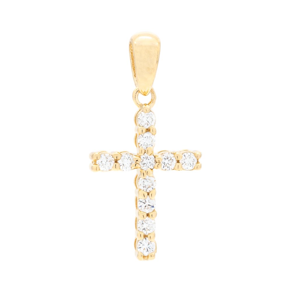 11 diamond prong set cross pendant with 1.4mm diamonds and solid, tapered bail.